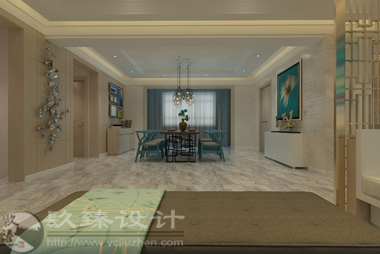 本案中室內整體色調偏向于冷色調,藍青色從視覺上帶給人寒冷的感觸,在小編的認知中,喜歡冷色調的人都是非常冷靜沉著的,事實證明就是這樣,業主本身非常穩重,他注重家庭關系的和諧,他覺得和諧能使人在視覺上,心理上獲得寧靜、平和的滿足。而且現在不是追求和諧社會嗎,和諧社會當然是從和諧家庭開始的。