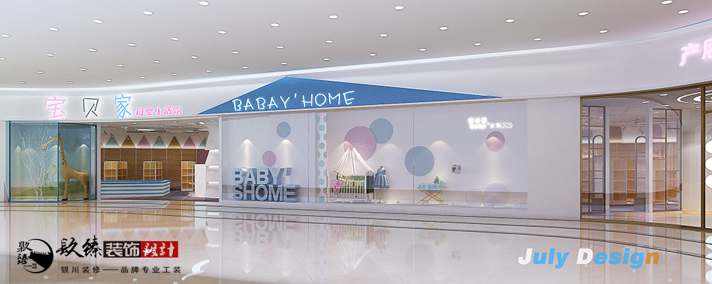 本案例是銀川裝修公司|銀川裝飾公司|銀川裝修網設計師李麗的作品。當大家看到下面的設計方案就應該可以感覺到了,李麗的設計作品總是能讓人感覺到很溫柔,大方,舒適。母嬰店的客戶群體通常都是小寶寶和父母,所以考慮到小寶寶,使用的都是比較清新的淡色系搭配。在造型上會以一些卡通的任務來加以裝飾,但盡量也都是減少一些復雜的飾物,以免對孩子們造成意想不到的危險。