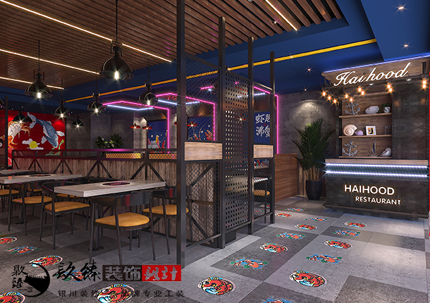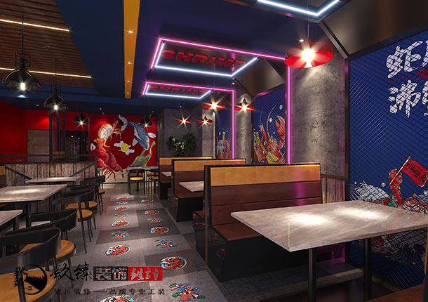 今天小編為大家重磅推薦銀川火鍋店裝修镹臻裝飾最新案例“大武口蝦哥魚妹紙包香鍋,這是一家專注于做“潮魚與美蝦“的特色餐飲,小編看到效果圖之后真的就被驚艷到了,色彩的沖擊使人看了之后內心有一種蠢蠢欲動的感覺,還沒被美食吸引,就首先被裝修吸引進去了。本項目位置在大武口萬達廣場,面積為120平米,銀川裝修|火鍋店裝修設計整體風格為工業風格,現在的工業風格餐廳越來越多,但是真正能把工業風格的美以正確的搭配展示出來的餐廳卻沒有多少,工業風格不只是按部就班的在空間內植入一些金屬水管等材質那么簡單,最終要的是如何將這些風格元素以更專業更自然的設計手法植入當中。而設計上魯玫,就將這一點做的很好,本案例只是稍微的融合了一部分的工業風元素,比如吊頂,軟裝的桌椅配飾、金屬隔墻、工業吊燈等等。