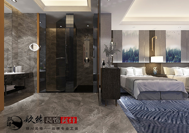 本酒店設(shè)計(jì)的標(biāo)準(zhǔn)間低調(diào)中不失奢華,衛(wèi)生間使用地磚,墻磚,金屬,玻璃等材質(zhì),會(huì)增加原本看起來(lái)比較小的空間,銀川裝修公司銀川酒店裝修設(shè)計(jì)視覺(jué)上給人一種明亮的感覺(jué),地毯用比較復(fù)古的深藍(lán)色系,和墻面的灰色搭配起來(lái)非常的有質(zhì)感,整體空間屬于比較冷色系的感覺(jué),純靜,安逸感油然而生。