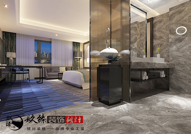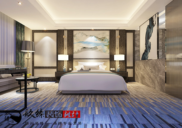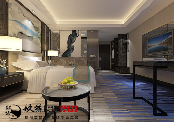 該酒店展現(xiàn)設計的大床房給人一種當代藝術感,墻面以及床頭的掛飾猶如一幅水墨畫,飄飄而來,輕輕而去。除了具有文藝氣息的裝飾畫以外,最具有現(xiàn)代感就屬地面的地毯和進門的衣帽柜了,設計師利用金屬與木頭兩種不同的材質搭配展現(xiàn)出現(xiàn)代的時尚感,一間平米不大的大床房間瞬間被銀川裝修公司銀川酒店裝修設計刻畫的高大尚了起來。