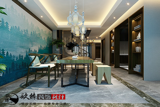 銀川裝修設計镹臻裝飾中的新中式別墅一共有三層,第一層除了客廳旁設計了茶室一間,對于成功人士來說中國的茶文化是不可缺的一部分,在品茶過程中體會人生中的苦樂酸甜,是對生活的一種向往。木質古典風格的桌椅身后是一幅布滿畫布的迎客松,要知道茶文化和迎客松都是中式文化中的精髓,所體現出的藝術形式正好符合該別墅的整體風格,樓梯處以鏤空造型的隔墻將兩個空間用專業的手法完美銜接。