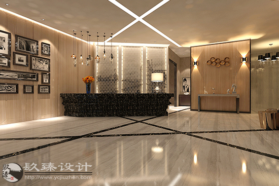 在大廳的設計上面,天花板的灰鏡上面呈現出與眾不同的造型燈,造型燈以耀眼的金黃色設計,更能彰顯整座大廳的高端、大氣的感覺,為整室形成一道亮麗的風景線,柔暖而簡約圖案的地板磚,中間相間的文理圖案跟天花板灰鏡中陳列的文案相互一致、相互協調,更能彰顯設計師在這塊的獨有天分和時尚質感,大廳的門以完全透明的玻璃設計,讓整個空間格局彰顯輕松明朗的感覺。