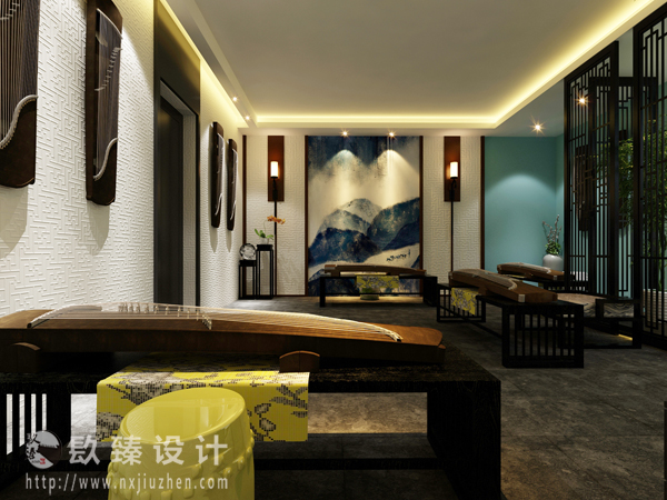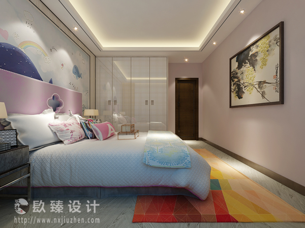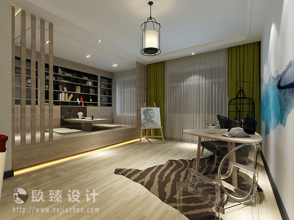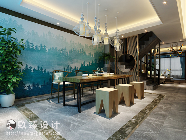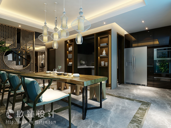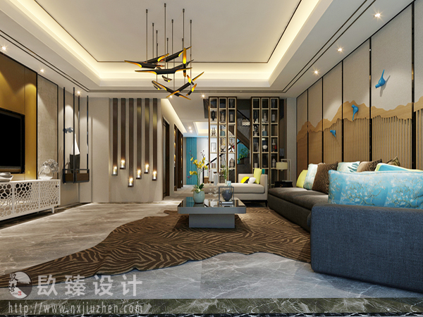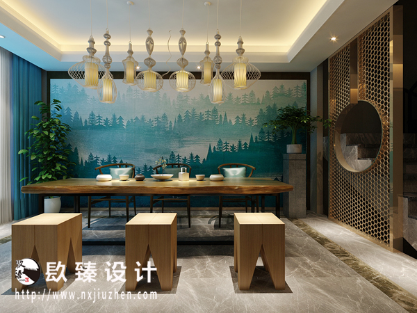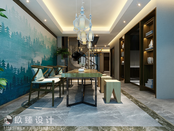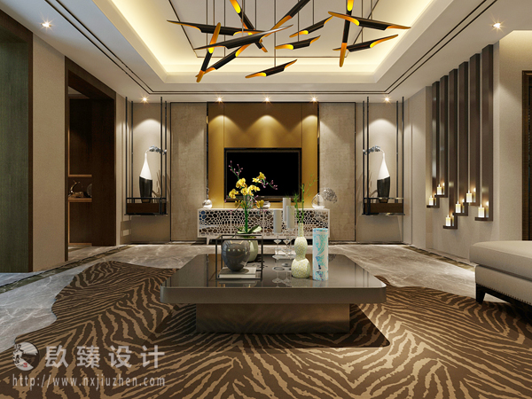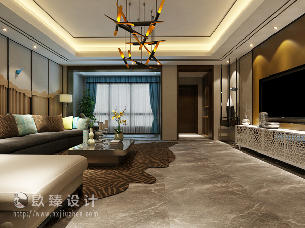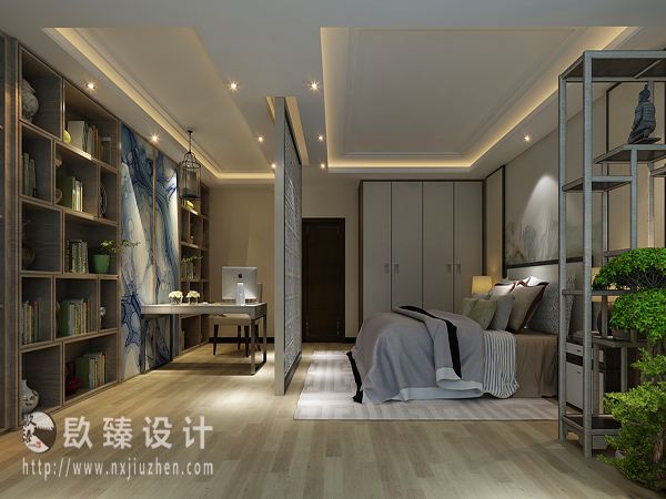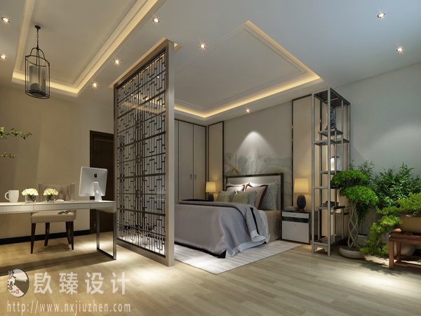 本案特點是將現代元素與傳統元素相互結合的形式而產生的,同時以現代人的觀點來體現出與傳統中國風格不一樣的設計。同時新中式風格大多數采用對稱性的設計,體現出一定的協調性。