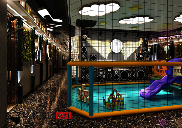 顧客在這種濃烈的氛圍之下一邊唱歌,一邊吃火鍋,真的是一種享受呢。所有的室內(nèi)設(shè)計最開始的初衷都是為了美觀的同時能更方便人們的體驗,在一樓的大廳還設(shè)計了一個小型的兒童設(shè)施,這樣更方便了一些帶小孩的顧客。