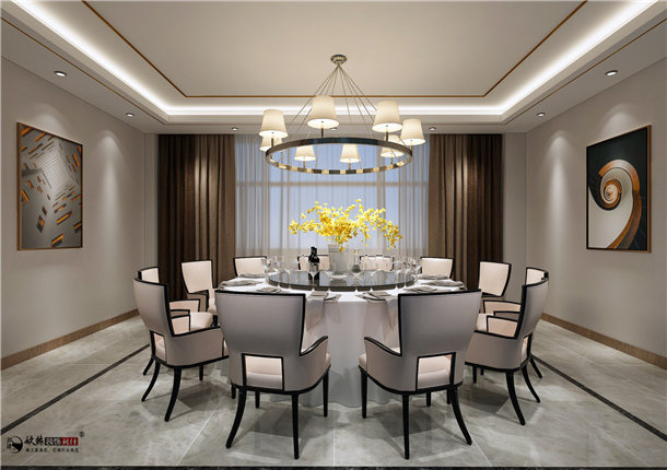 在基礎(chǔ)的硬裝設(shè)計(jì)中以木質(zhì)與石材相結(jié)合,采用現(xiàn)代的設(shè)計(jì)弧線的處理手法刻畫生出一個(gè)具備文化性、象征性、裝飾性的空間,空間中的藝術(shù)表達(dá)手法,除了在硬裝部分設(shè)計(jì)師使用現(xiàn)代手法,在軟裝配飾上還使用了一些藝術(shù)品烘托整體空間氛圍。追求設(shè)計(jì)極盡美感的豐盈,同時(shí)又獨(dú)具韻味,不失簡(jiǎn)約精致的意境,是整體項(xiàng)目操作的思路。統(tǒng)一于都市主義風(fēng)尚中的,還有輕奢質(zhì)感的專心打磨,同時(shí)跳脫桎梏的前衛(wèi)、自由、張力。一樓大廳用餐區(qū)沒有過于搶眼的造型,也沒有濃墨重彩的渲染,而是以最經(jīng)典的現(xiàn)代設(shè)計(jì)筆觸,令金屬、皮革、石材等所有元素協(xié)調(diào)相處,并選用帶有高級(jí)感的中性色、溫馨舒適低調(diào)奢華,使整體空間具有很強(qiáng)的飽和度。