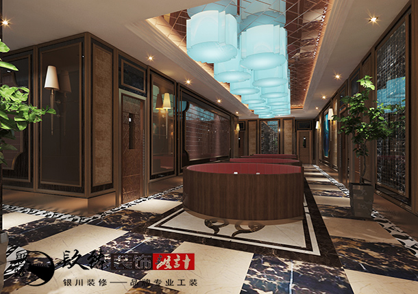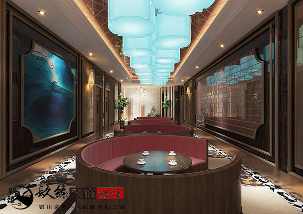 該燒烤店門頭的設計因房屋場所管理受限,所以在設計上比較簡約一些,但是進入房屋空間內,瞬間讓人眼前一亮,大廳內兩邊墻面造型裝飾一面以木質造型植入、另一面是光面材質的鋪貼,相互映襯,再加上頂面藍色的水晶吊燈,宛如一幅星空藝術畫作。以圓形卡座充分合理的利用的空間,自然流暢的融入進去,大廳的整體色系以深棕色為主調,大家都知道,餐飲行業非常容易被油煙所污染,即使店家已經很努力的去保護整潔的環境,但是還是避免不了受到一些污染,所以深色系的地磚,墻體會更實用一些。 說到這點,您也許會有顧慮,在餐廳中大量的使用暗色系會不會顯得很壓抑呢?在這里小編想說的是,作為一位資深的設計師,即使是大量的使用暗色系作為主色調,也會選擇更多的明亮且時尚的元素加以點綴,完美刻畫的。所以,就請大家靜靜地欣賞一下《璽云燒烤》門廳部分的設計案例吧。