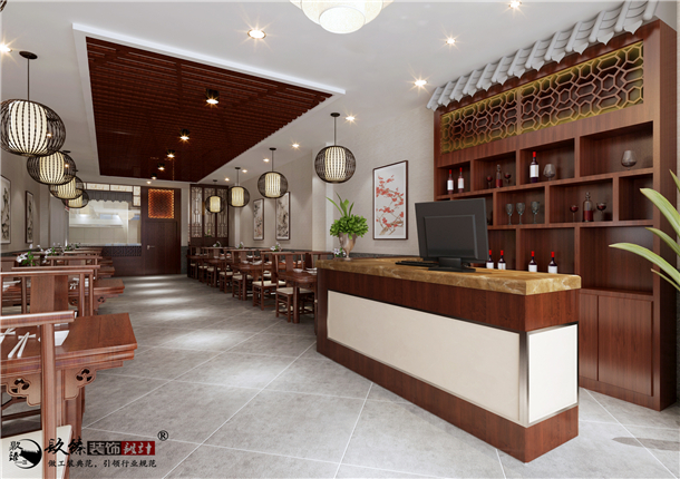 銀川餐廳裝修|銀川餐廳裝修設計|镹臻裝飾設計師在新中式風格中餐廳裝修設計的時候,秉承為顧客營造一個時尚、舒適、又不失文化底蘊的就餐環(huán)境為中心。推門進入,映入眼簾的是吧臺區(qū)域,簡單的吊頂加上漂亮的燈飾,唯美大氣。同時,在燈光的設計上面,設計師又用溫馨的暖色燈光與燈籠造型的燈飾做渲染,烘托整個空間,給人以沉靜舒適的景象。