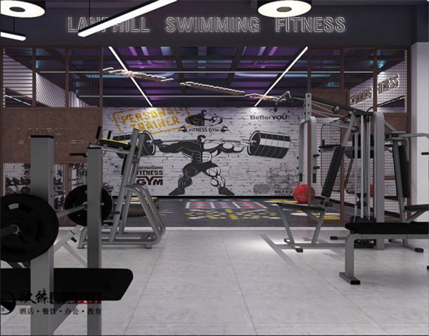以黑色、黃色為主色調,利用鐵藝打造工業風格,本設計的一大亮點就是前臺側面的啞鈴雕塑。前臺、雕塑、接待區均采用鐵板制成。鐵藝的運用打造濃濃工業風。